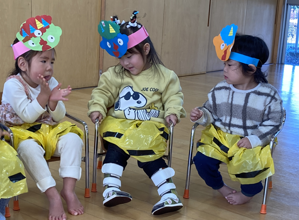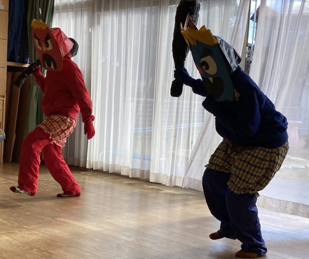 おにはそと! 2月3日なのはなホームでも節分をしました。 前の週からおにのお面を作ったりダンスや歌で気持ちを盛り上げてあそんでいたこどもたちでしたが、当日おにが登場するとドキドキ。それでも、豆に見立てたお手玉を一生懸命「おにはそと!ふくはうち!」と投げて、見事におにをやっつけることができました。 最後はおにと一緒に楽しくダンスをして仲直りすることもできて “バイバイ”と手を振ってお別れしました。 今年一年無病息災でみんなが元気に過ごせますように。